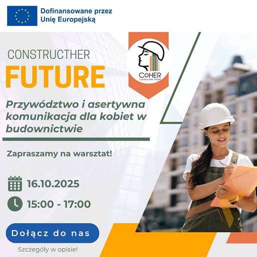 Serdecznie zapraszamy do udziału w wyjątkowym, bezpłatnym warsztacie online „Przywództwo i asertywna komunikacja dla kobiet w budownictwie” (Leadership & Assertive Communication for Women in Construction), organizowanym w ramach projektu „Zbuduj jej przyszłość” (ENG: Construct Her Future), dofinansowanego przez Unię Europejską (Program: Erasmus+, Nr projektu: 2024-1-IE01-KA220-VET-000257661).