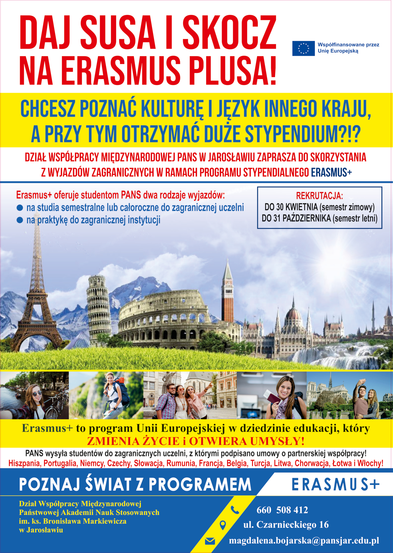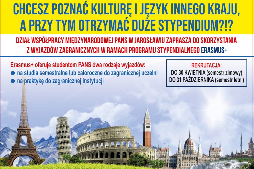 Dział Współpracy Międzynarodowej zaprasza studentów wszystkich kierunków PANS w Jarosławiu do skorzystania z możliwości realizacji części studiów w zagranicznych uczelniach w ramach programu ERASMUS+ (wyjazdy na semestr letni roku akademickiego 2025/2026).