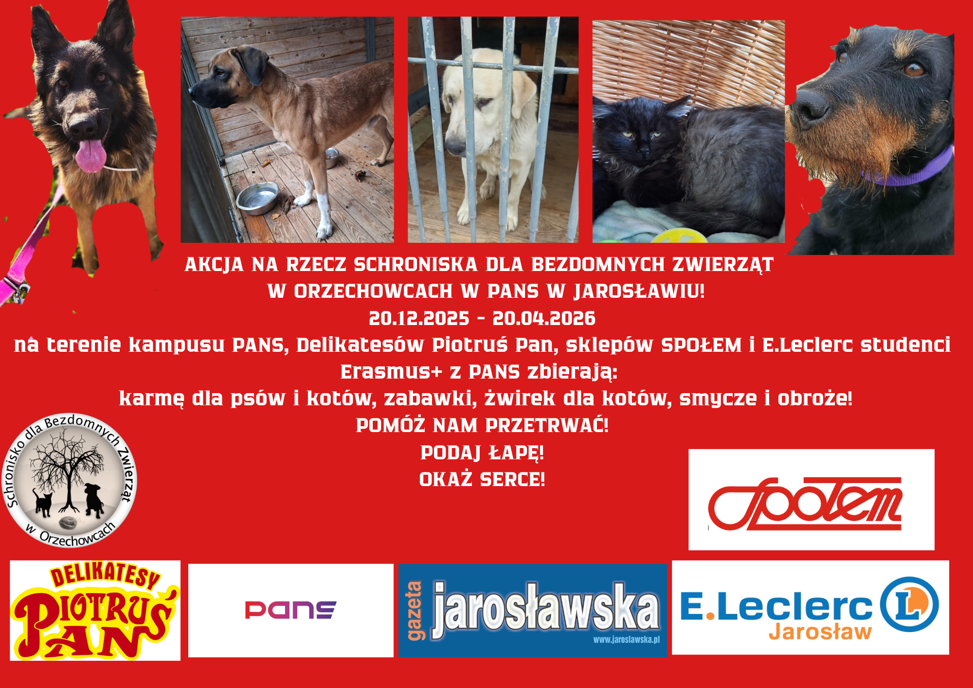 Kierownik Działu Współpracy Międzynarodowej Państwowej Akademii Nauk Stosowanych im. ks. Bronisława Markiewicza w Jarosławiu, dr Magdalena Bojarska i zagraniczni studenci przebywający w naszej Uczelni w ramach programu Erasmus+ organizują charytatywną akcję na rzecz Schroniska dla Bezdomnych Zwierząt w Orzechowcach, która odbędzie się w dniach od 20.12.2025 do 20.04.2026 r. na terenie kampusu i w wybranych sklepach.