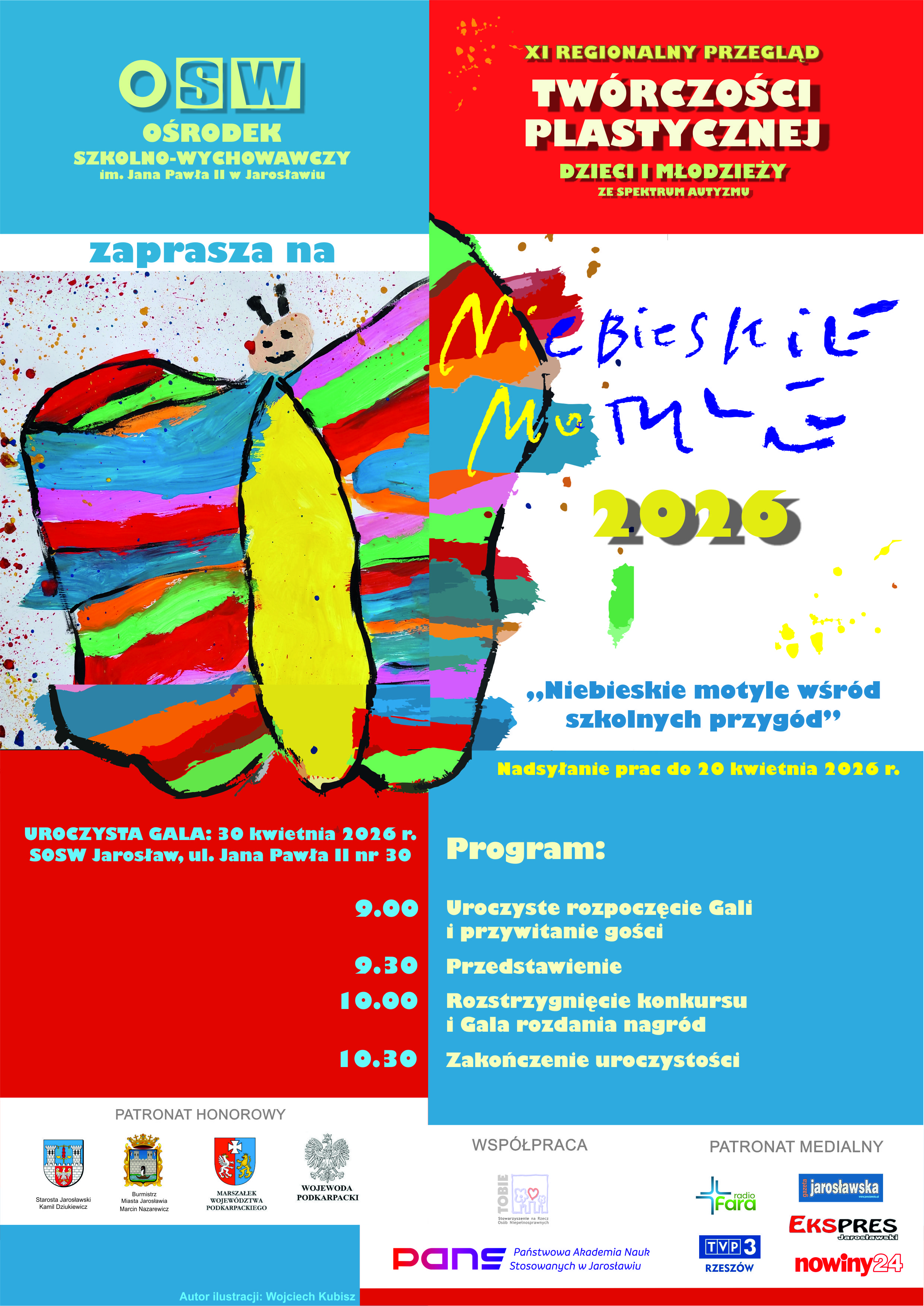 Dyrekcja oraz Pracownicy Specjalnego Ośrodka Szkolno-Wychowawczego im. Jana Pawła II w Jarosławiu zapraszają do udziału w XI edycji Regionalnego Przeglądu Twórczości Plastycznej Dzieci i Młodzieży ze Spektrum Autyzmu „Niebieskie Motyle 2026”.