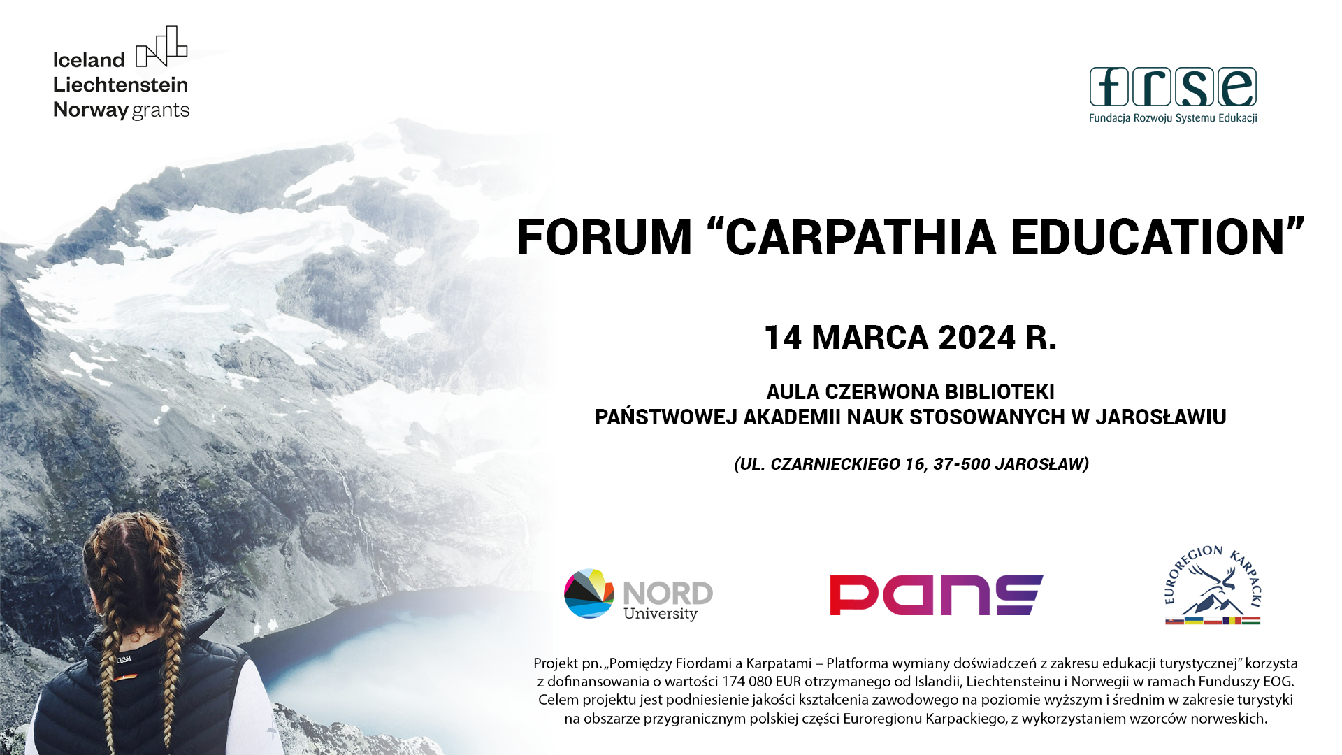 Euroregion Karpacki wdraża Markę Karpacką CARPATHIA jako strategiczny koncept społeczno – gospodarczy dla Karpat. Jego celem jest uczynienie z Karpat destynacji turystycznej o znaczeniu globalnym, wspierającym budowę wspólnej przestrzeni społeczno – gospodarczej w Karpatach. Proces budowy Marki przebiega w zgodzie z nowymi paradygmatami rozwoju Euroregionu, którymi są Integracja – Komercjalizacja – Instytucjonalizacja. Aby zapewnić powodzenie w tym przedsięwzięciu kluczowa jest wiedza, kompetencje i umiejętności jego uczestników. Dlatego Euroregion wspólnie z PANS Jarosław i Nord University w Bodo realizuje projekt CARPATHIA Education, którego, celem jest opracowanie optymalnych narzędzi edukacyjnych dla naszych partnerów i kluczowych aktorów Marki CARPATHIA. Forum CARATHIA Education jest wydarzeniem, w którym podsumujemy dotychczasowe działania oraz zaprezentujemy plany na przyszłość. Wydarzenie stworzy możliwość do spotkania środowisk samorządowych, kadry, studentów i uczniów szkół zawodowych średnich oraz wyższych, a także organizacji działających w obszarze turystyki w regionie i na terenie całego Euroregionu Karpackiego. W wydarzeniu wezmą udział krajowi i zagraniczni eksperci, partner norweski, specjaliści zagraniczni. Forum będzie miejscem wymiany doświadczeń i nabycia dobrych praktyk, stworzy tez możliwość podsumowania efektów realizacji projektu.