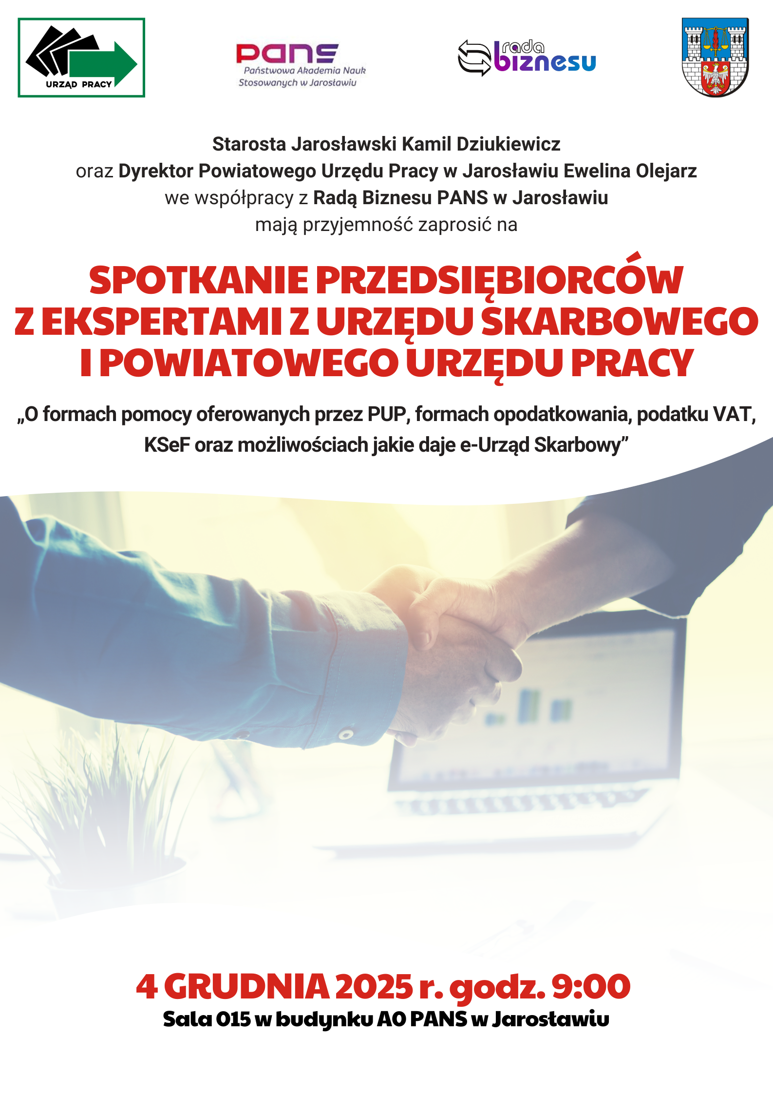 Na spotkanie – współorganizowane przez Radę Biznesu PANS w Jarosławiu – zapraszają Starosta Jarosławski Kamil Dziukiewicz i Dyrektor Powiatowego Urzędu Pracy w Jarosłąwiu, pani Ewelina Olejarz.